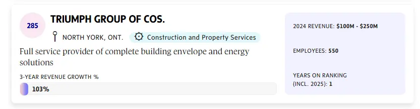 Triumph Group of Companies is proud to announce its inclusion in The Globe and Mail’s 2025 Report on Business ranking of Canada’s Top Growing Companies. Triumph secured the #285 spot in the Construction category, achieving an impressive 103% three-year revenue growth between 2021 and 2024.